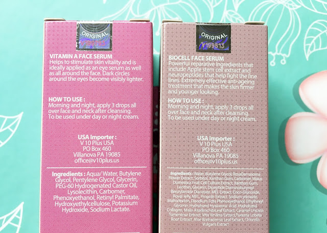 On the left side of my hand, I have the Vitamin A serum and on the right side of my hand, I have the Biocell serum.